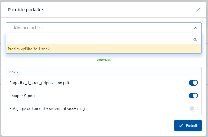 Po izbiri vrste dokumenta kliknite »Potrdi«. Sistem vas preusmeri na obrazec za dodajanje dokumenta, kjer so:- vključene vse priponke,