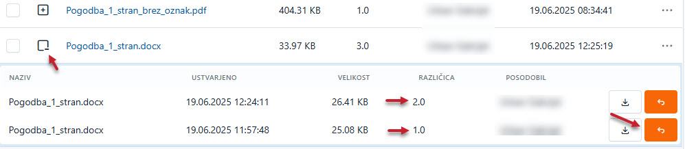 Dokumentni sistem omogoča povrnitev priponke na starejšo (predhodno) različico.