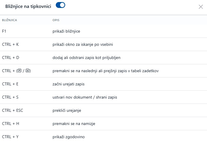 Uporaba tipkovničnih bližnjic v mDocs+ uporabniku omogoča izvajanje pogosto uporabljenih funkcij brez potrebe po klikanju z miško.