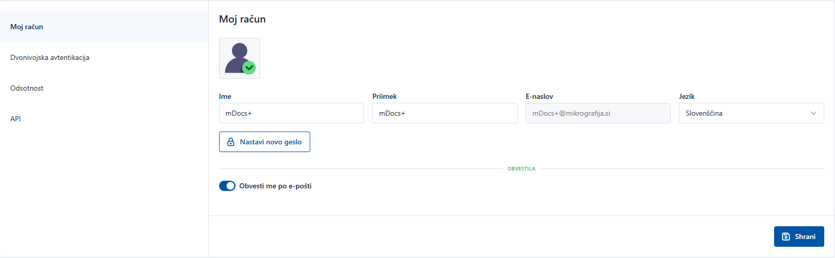 - Obvesti me po e-pošti: S premikom gumba v desno uporabnik aktivira sistemsko funkcionalnost obveščanja po e-pošti. S premikom v levo uporabnik obveščanje iz sistema ustavi.