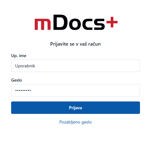 Možnosti so odvisne od konfiguracije za vašo organizacijo. Tipi prijave so lahko z uporabniškim imenom in geslom ali z aktivnim imenikom. Uporabnik se v sistem prijavi preko prijavne vnosne maske. Ob prijavi sistem prevzame privzeti jezik dokumentnega sistema. Dokumentni sistem je lahko povezan z aktivnim imenikom naročnika, pri čemer sta uporabniško ime in geslo enaka domenskemu uporabnika.